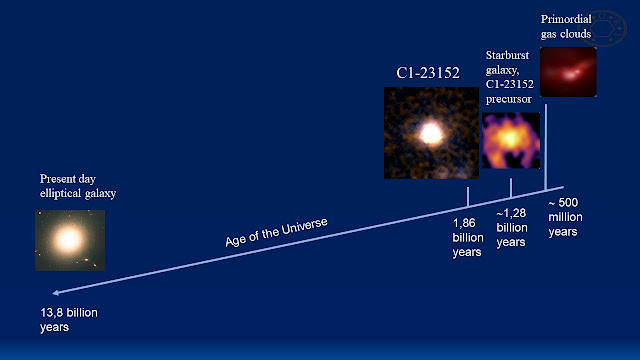So young and already so evolved: thanks to observations obtained at the Large Binocular Telescope, an international team of researchers coordinated by Paolo Saracco of the Istituto Nazionale di Astrofisica (INAF, Italy) was able to reconstruct the wild evolutionary history of an extremely massive galaxy that existed 12 billions years ago, when the Universe was only 1,8 billions years old, less than 13% of the present age. This galaxy, dubbed C1-23152, formed in "just" 500 million years, an incredibly short time to give rise to a mass of about 200 billion suns. To do so, it produced as many as 450 stars per year, more than one per day, a star formation rate almost 300 times higher than the current rate in our galaxy, the Milky Way. The information obtained from this study will be fundamental for galaxy formation models for which the nature of objects such as C1-23152 is still difficult to account for.